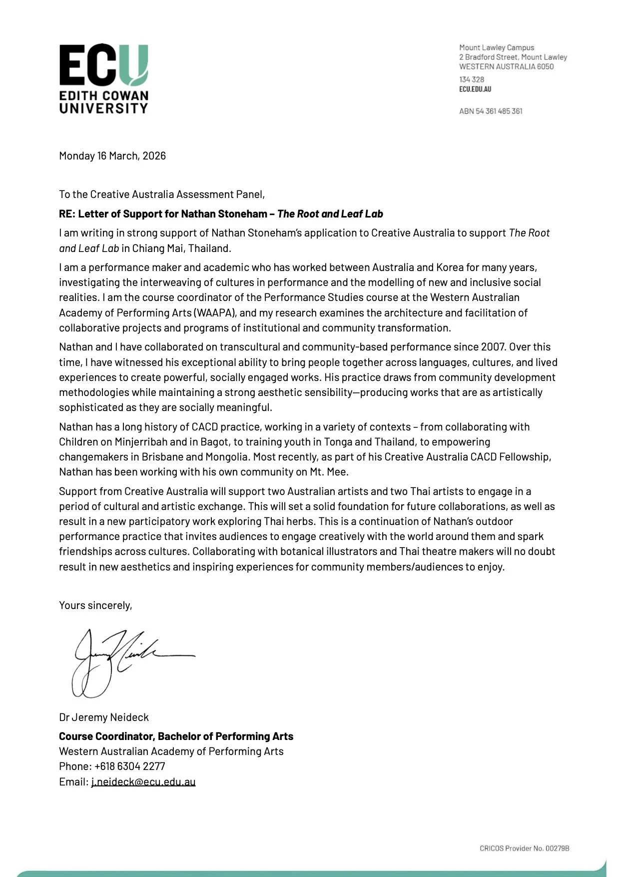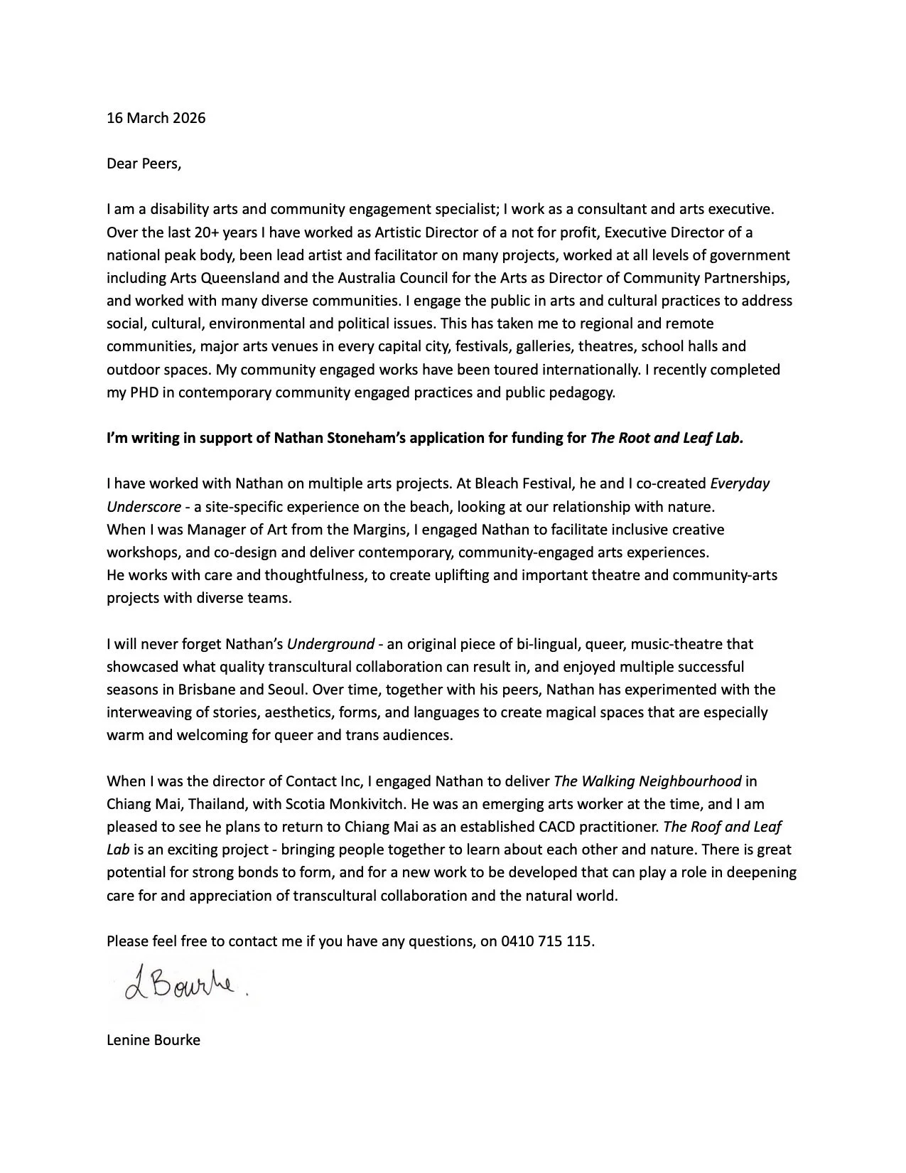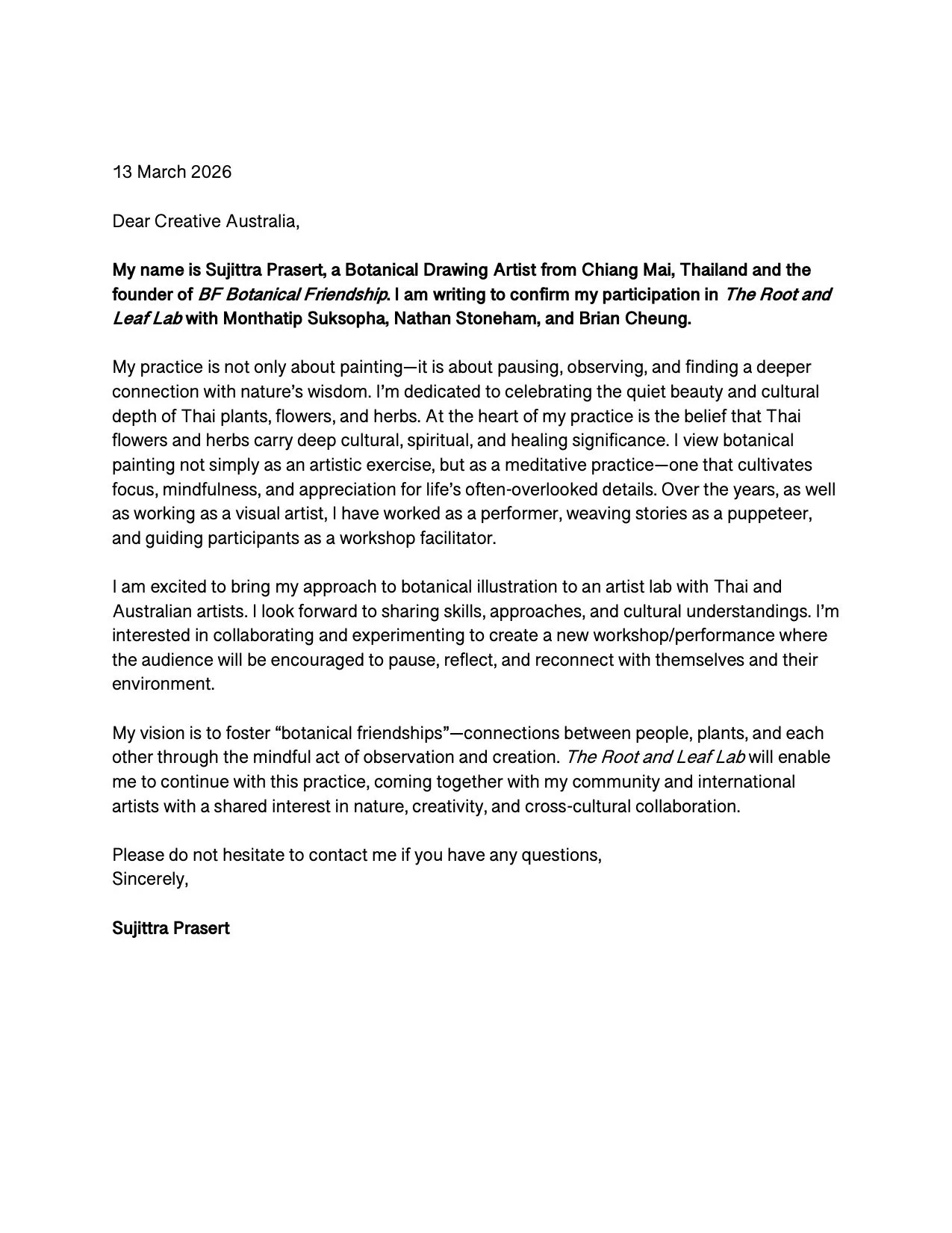 The Root and Leaf LabLetters of Confirmation / Support Letters of ConfirmationVenue Partner and Artist: Dhepsiri Creative Space, Monthatip Suksopha Artist: Sujittra Prasert Letters of SupportLenine Bourke Jeremy Neideck See Artistic Support Material